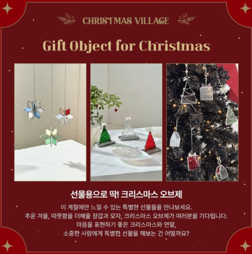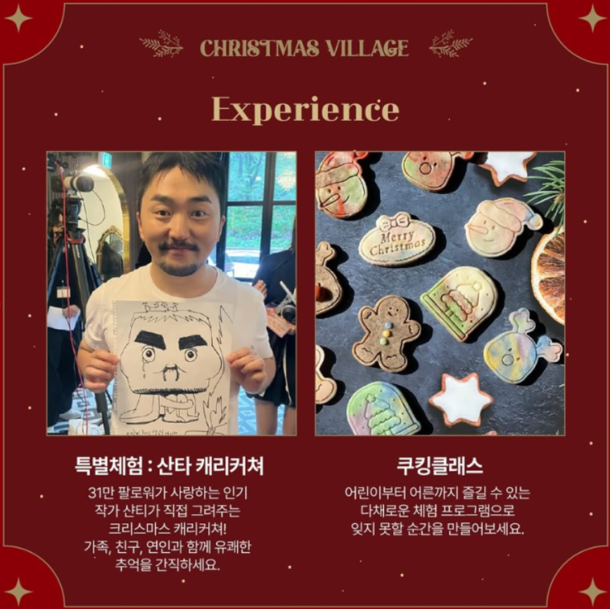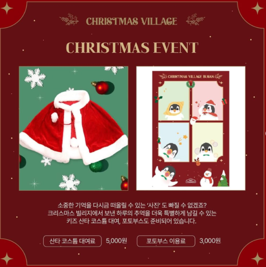 - 포토 부스 & 코스튬 대여: 크리스마스를 기념할 수 있는 포토 부스(3,000원)와 키즈 산타 코스튬 대여(5,000원)도 마련되어 있습니다.