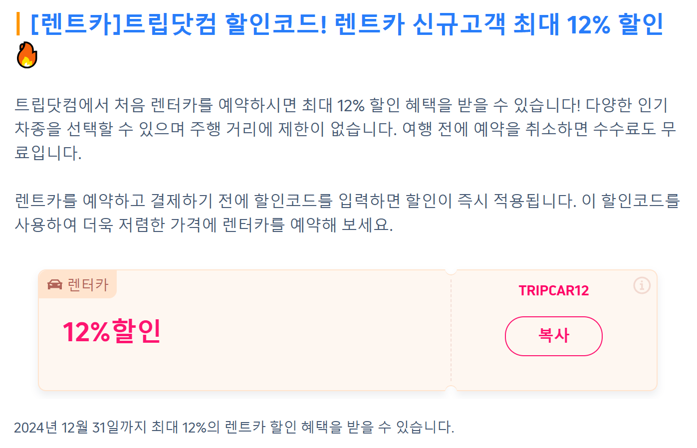 여행 시 필수인 렌터카에도 할인코드 적용이 가능합니다.