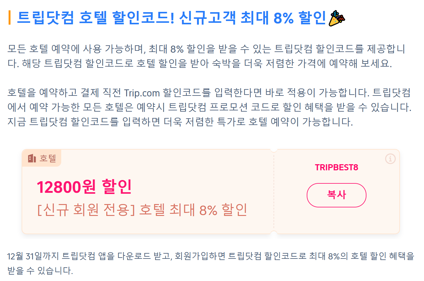 트립닷컴 제휴 호텔에 적용 가능한 할인코드로, 지역별 특화된 혜택을 제공합니다.