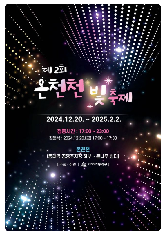 온천천 빛축제는 올해로 제2회를 맞이하며, 가족, 연인, 친구와 함께 소소한 추억을 만들기 좋은 행사입니다.