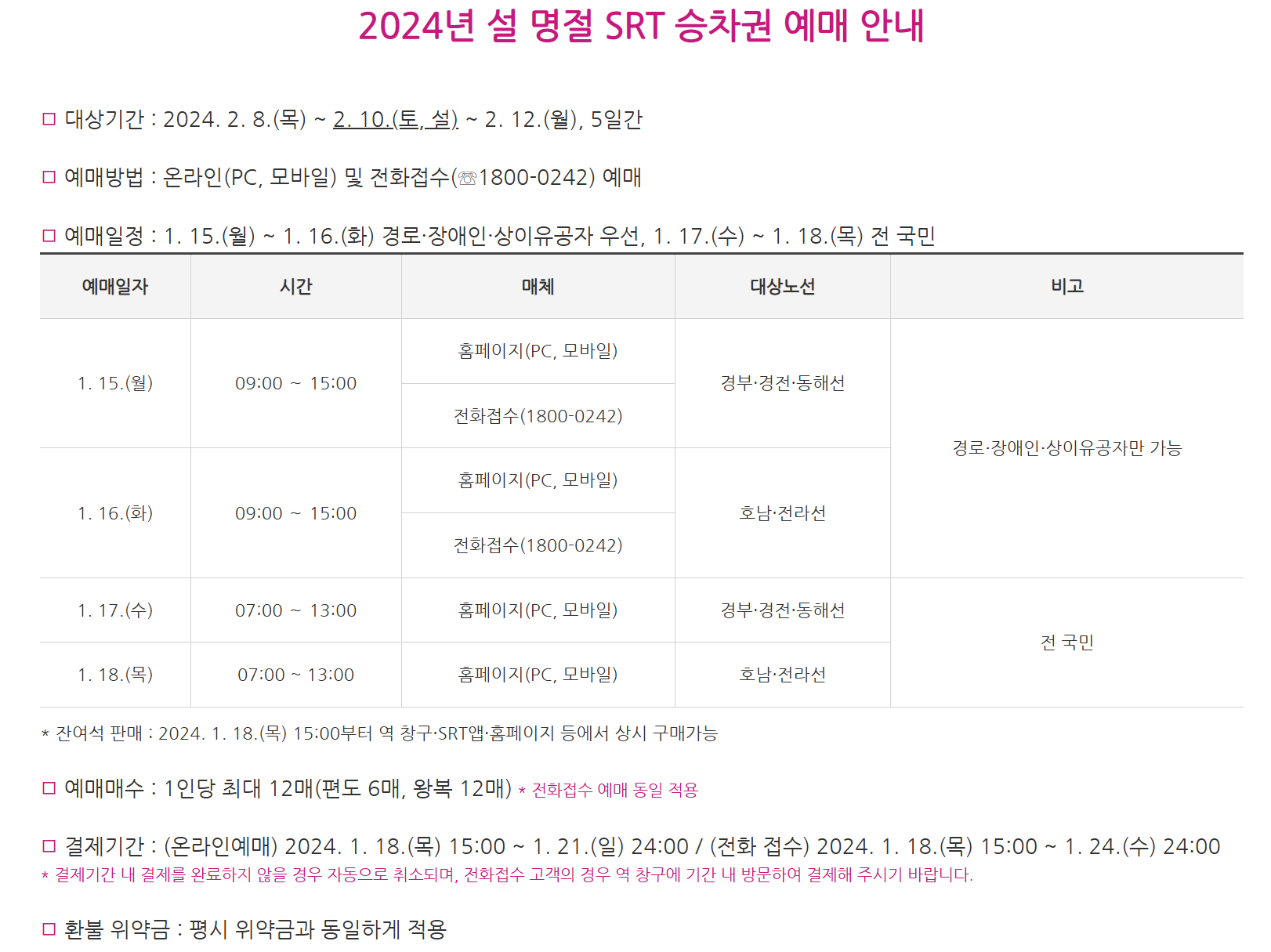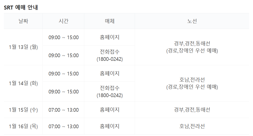 - 1월 16일(목) 15:00부터: 역 창구, 홈페이지, SRT 앱 등에서 상시 발매