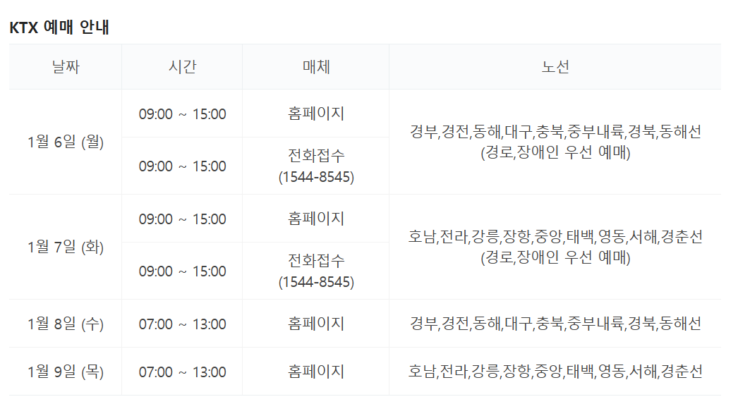 - 1월 9일(목) 15:00부터: 역 창구, 홈페이지, 코레일톡 앱 등에서 상시 발매