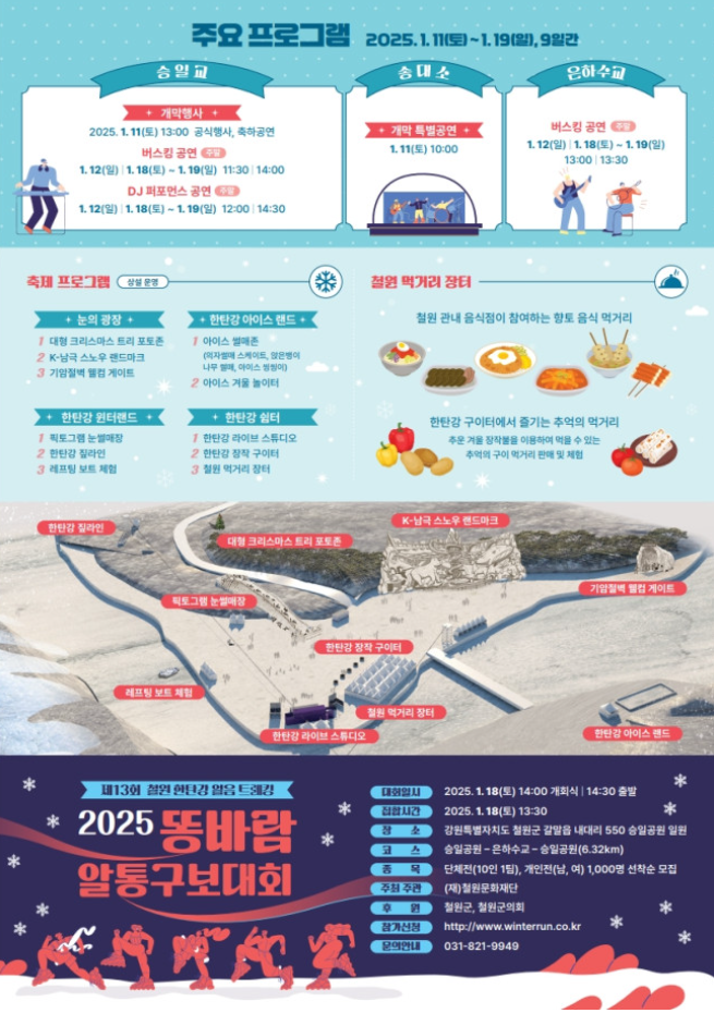 - 1월 18일 14시부터는 똥바람 알통구보대회가 열립니다. 6.32km 코스를 달리는 이 대회에 참여하면, 한탄강 유네스코 세계지질공원에서의 특별한 경험을 남길 수 있습니다.