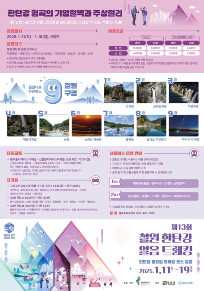 2025 철원 한탄강 얼음트레킹 축제는 자연의 아름다움과 다양한 체험 프로그램을 동시에 즐길 수 있는 겨울 여행지입니다. 겨울철만의 특별한 매력을 만끽하고, 아름다운 자연을 배경으로 특별한 추억을 만들어 보세요.